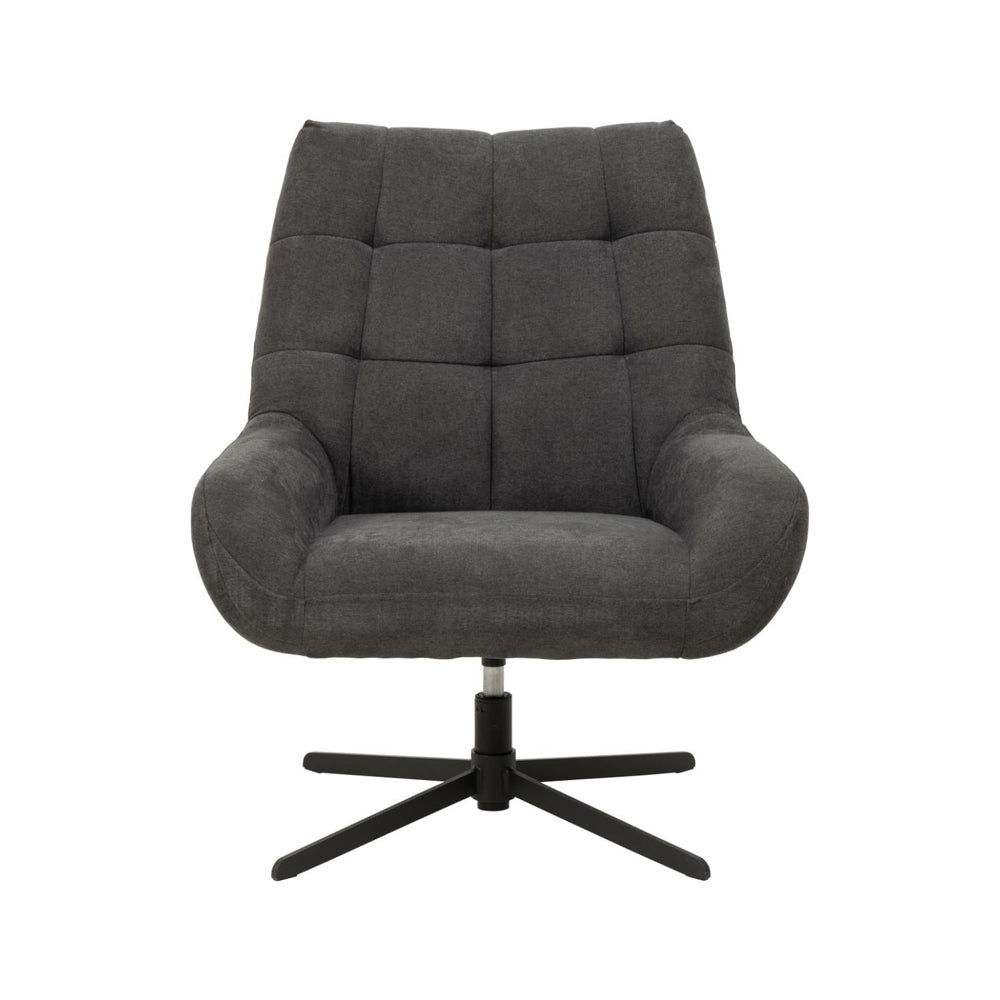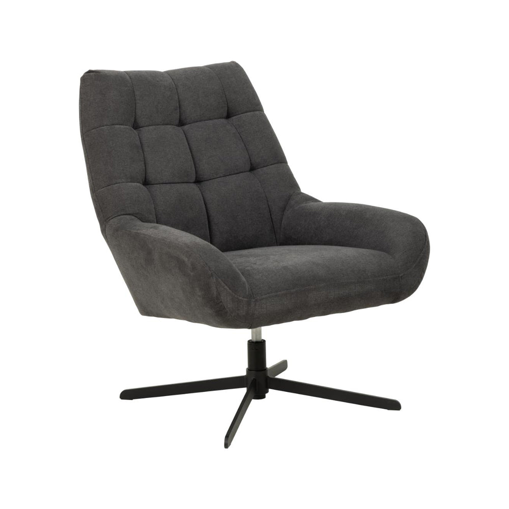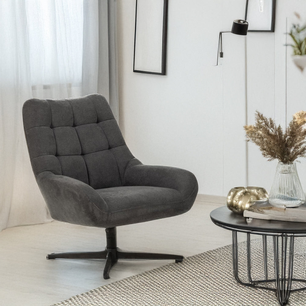 Una silla de diseño geométrico que destaca también por su generoso acolchado y por la base de estrella que permite un movimiento giratorio para mayor comodidad. El tapizado en color gris oscuro es una base interesante para complementar espacios que apuesten por el minimalismo o un estilo elegante y sobrio.